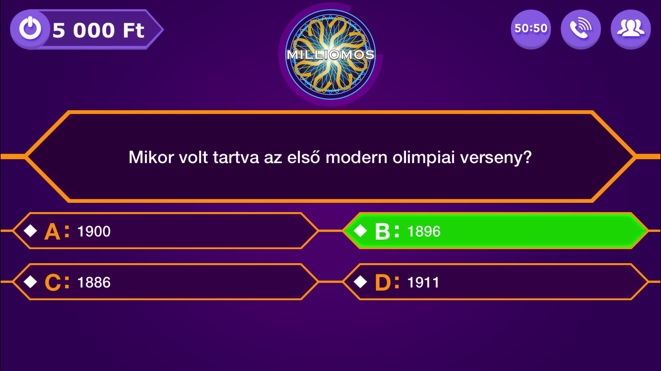 • A játékosnak 15 kérdésre kell helyesen válaszolni ahhoz, hogy elérje a legnagyobb pontszámot.